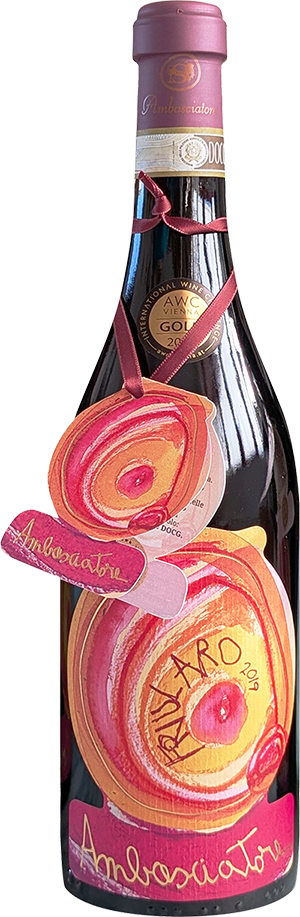 L’opera è realizzata con la tecnica ad acquerello e pastelli ad olio. Al centro è raffigurato un acino d’uva maturo, avvolto da cerchi concentrici che richiamano l’idea di unità, collaborazione e cooperazione, valori fondanti per i soci della Cantina. L’esecuzione grafica è legata all’atto creativo spontaneo dove i colori dell’uva diventano protagonisti: la luce del giallo, la forza del rosso e la contemplazione del magenta. Il tralcio dorato, frutto della terra, della cooperazione e del lavoro condiviso, ricorda la ricchezza delle relazioni umane, l’impegno collettivo ed evoca l’essenza racchiusa nel vino simbolo: Friularo Ambasciatore DOCG.